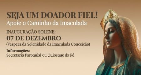 “um pequeno passo, o nosso grande Sim para Maria”Caminho da Imaculada: o Passo da Fé que Transforma o Nosso Encontro Fomos convidados a sonhar juntos: construir o Caminho da Imaculada, um novo espaço de devoção à Nossa Senhora, inspirado no carisma de São Francisco. Nosso propósito é concluir este Caminho até 7 de dezembro, véspera da Solenidade da Imaculada Conceição. Participe da campanha “Dando o Passo da Imaculada”. Sua contribuição é um ato de amor e fé que tornará possível este Espaço-Abraço dedicado à Mãe Imaculada. Para colaborar e dar o seu passo até 07/12, procure a Secretaria Paroquial. Que a Virgem Imaculada nos abençoe e nos guie neste caminho de fé e união.